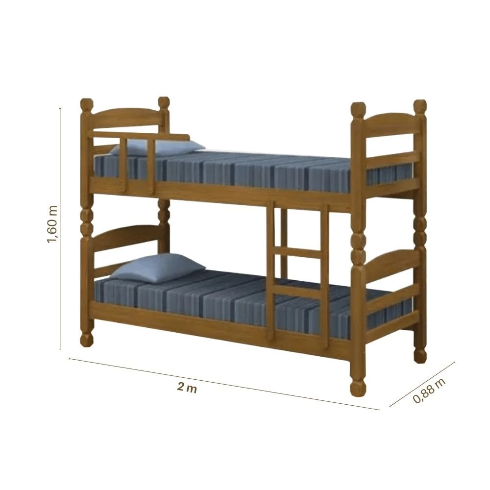 Produto desenvolvido para quartos com pouco espaço, casas e apartamentos, sem perder o estilo. Esta Beliche é produzida em madeira pinus maciça e conta com acabamento em cores modernas e atuais, além de ser super resistente e ter alta durabilidade. Ecologicamente correta, toda madeira utilizada na fabricação desse produto é de reflorestamento, tratada e seca em estufas, com umidade ideal, seguindo os padrões internacionais de qualidade. Ela também pode facilmente ser transformada em duas camas de solteiro, além de possuir fácil montagem.