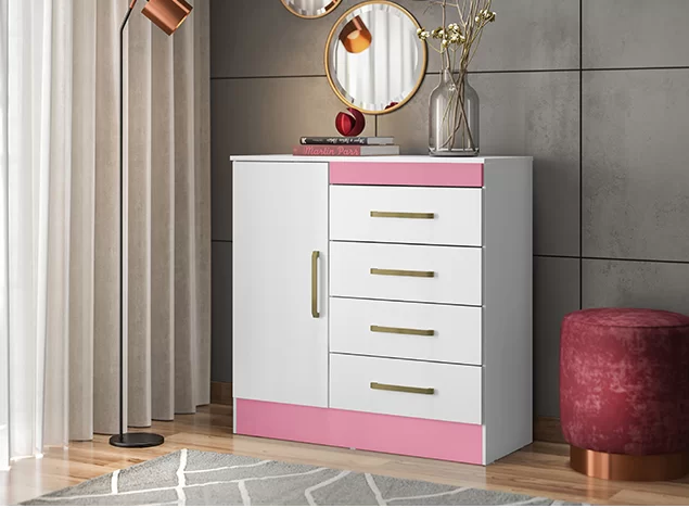 A Cômoda Montevideu possui 4 gavetas e 1 porta, além de contar com um design moderno que combina perfeitamente com qualquer decoração, deixando o seu cômodo mais organizado e bonito. E para aproveitar ainda mais a versatilidade desse móvel, sobre a bancada pode colocar objetos de decoração, porta-joias, perfumes, cosméticos e o que mais desejar, deixando o acesso à esses acessórios mais rápido e fácil no dia a dia.