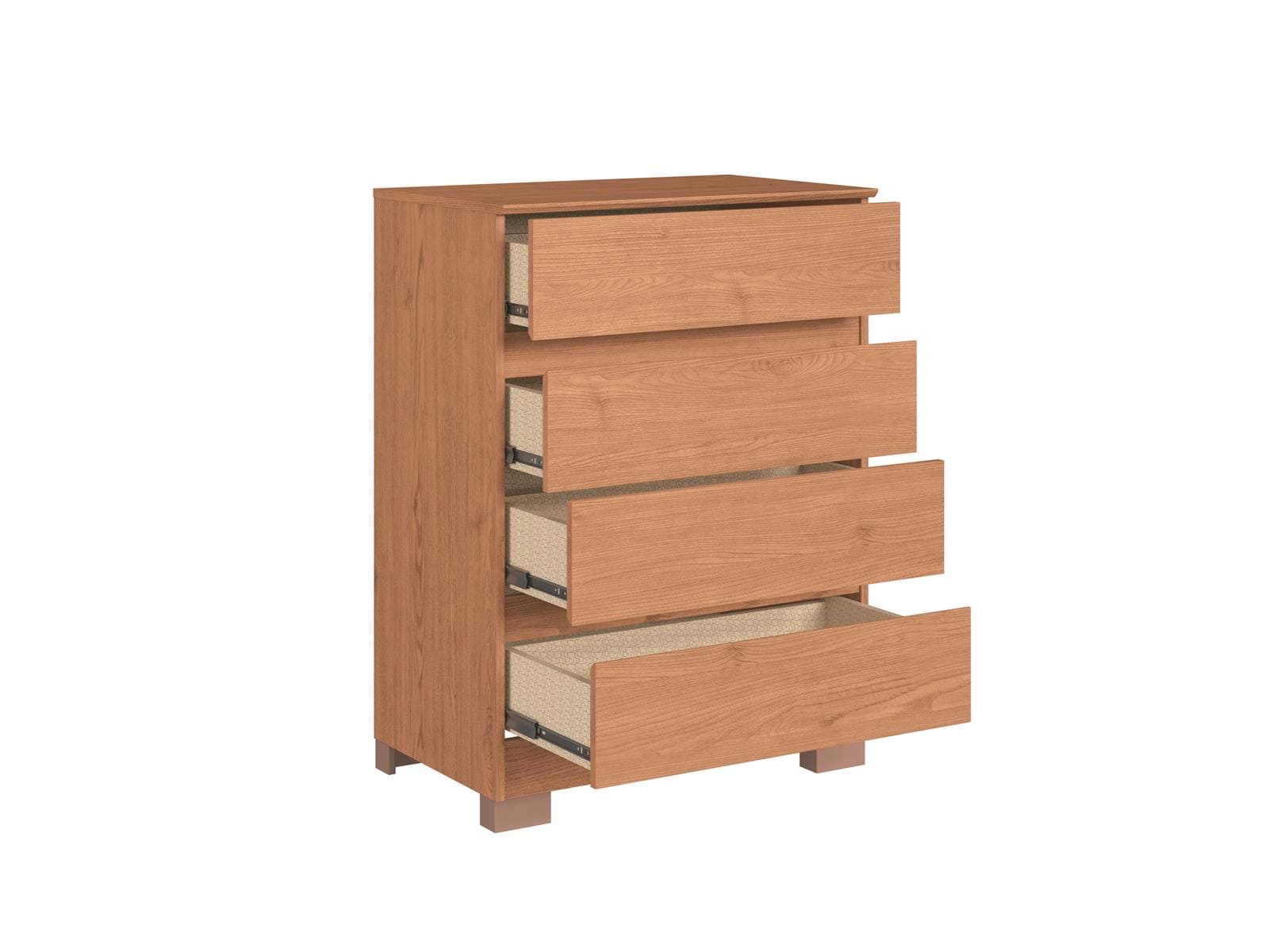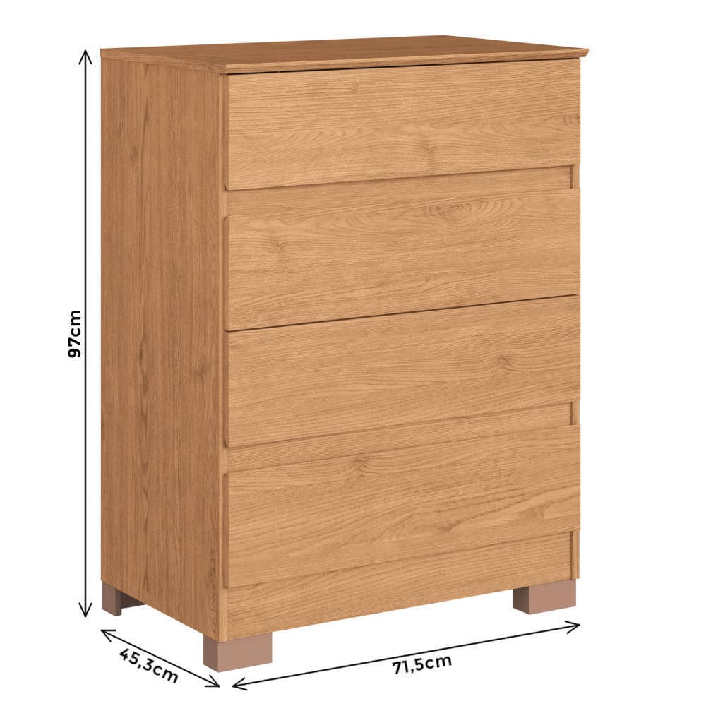 A Cômoda Maia é equipada com 4 gavetas, cada uma com a capacidade de suportar até 4 kg, garantindo espaço suficiente para organizar roupas, acessórios e outros itens essenciais. As corrediças telescópicas, presentes em cada gaveta, asseguram um deslizar suave e silencioso, aumentando a praticidade na utilização do móvel.
