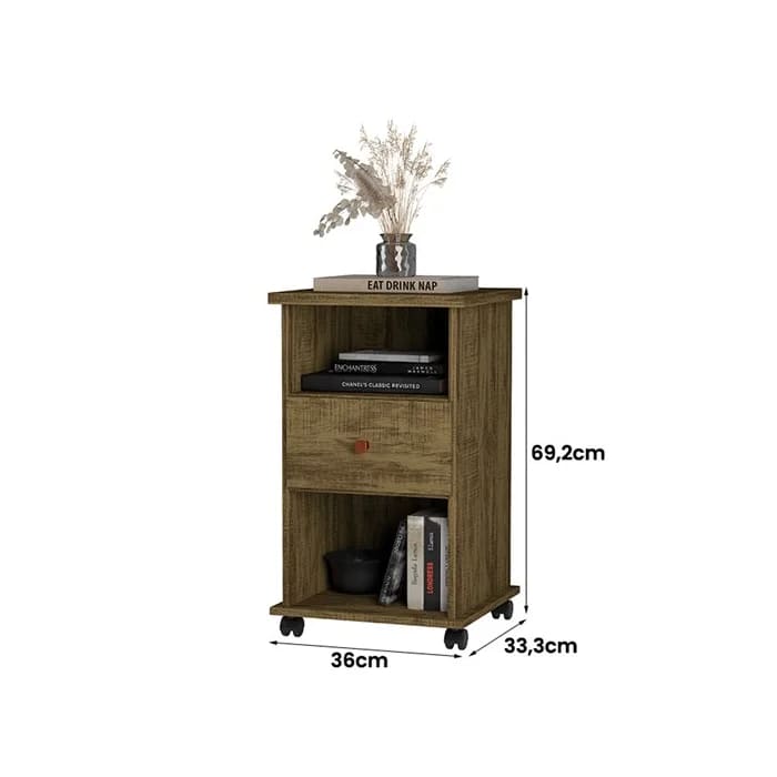 A Mesa de Cabeceira Otto é o produto ideal para ter no quarto. Ela é bonita, compacta e possui rodízios que auxiliam na movimentação do produto, facilitando na hora da limpeza. Conta com uma espaçosa gaveta, ideal para armazenar itens de uso diário. Também possui dois nichos e um amplo tampo, perfeitos para acomodar peças decorativas e itens que sempre precisamos ter por perto, como: celular, despertador, livros, entre outros.